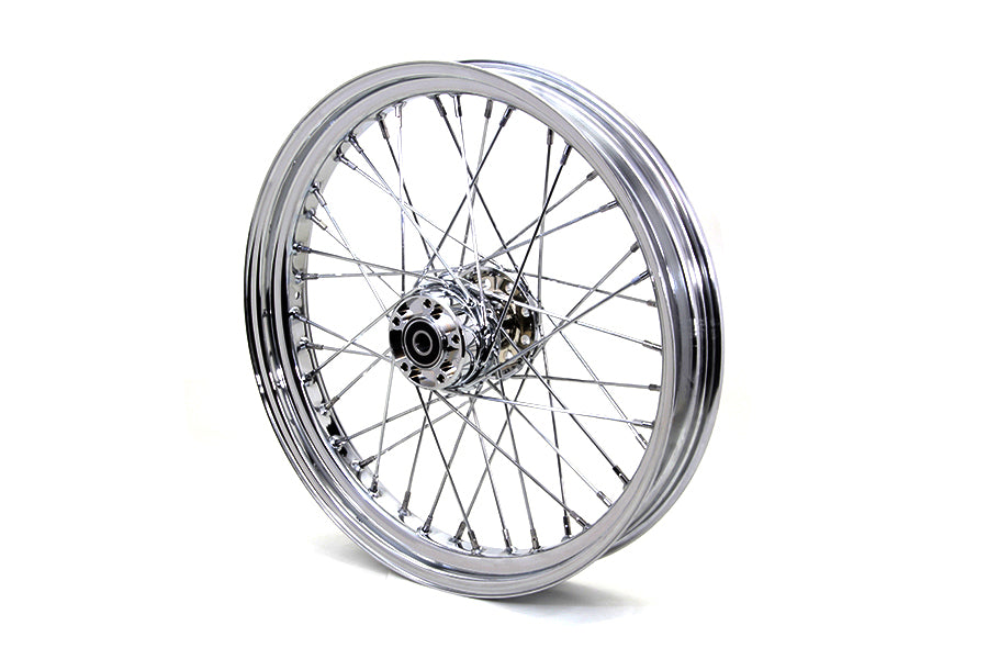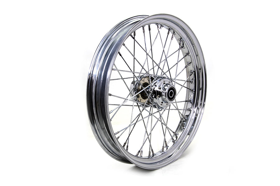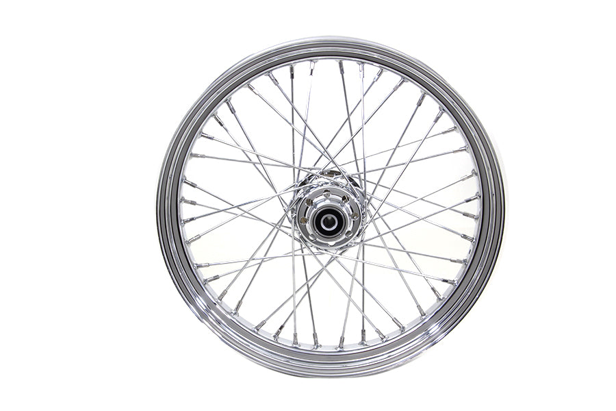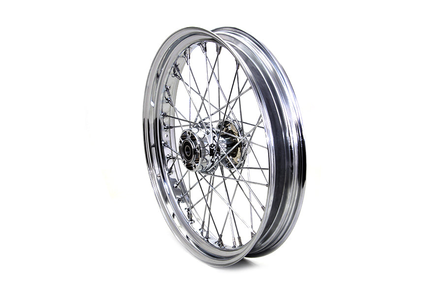 Front 21" x 3.25" wheel assembly features a chrome hub with all internal bearings installed, 40 spokes, and a chrome rim laced and trued.