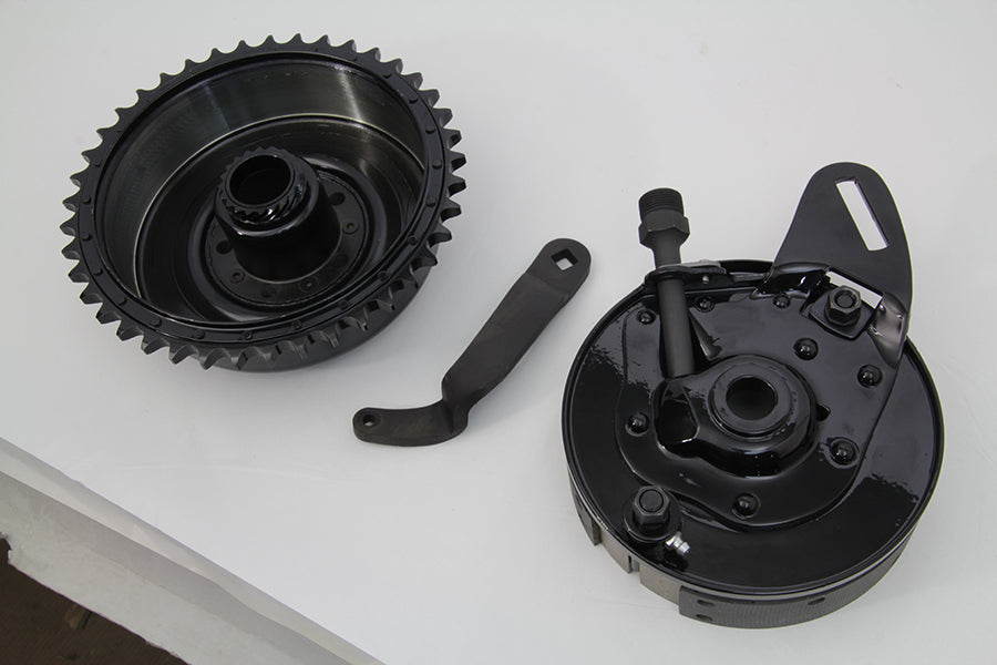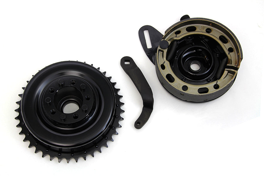 Includes black rear brake drum with sprocket riveted on, black backing plate aseembled with shoes, springs, cam, pivot stud, parkerized arm and parkerized speedometer drive.
