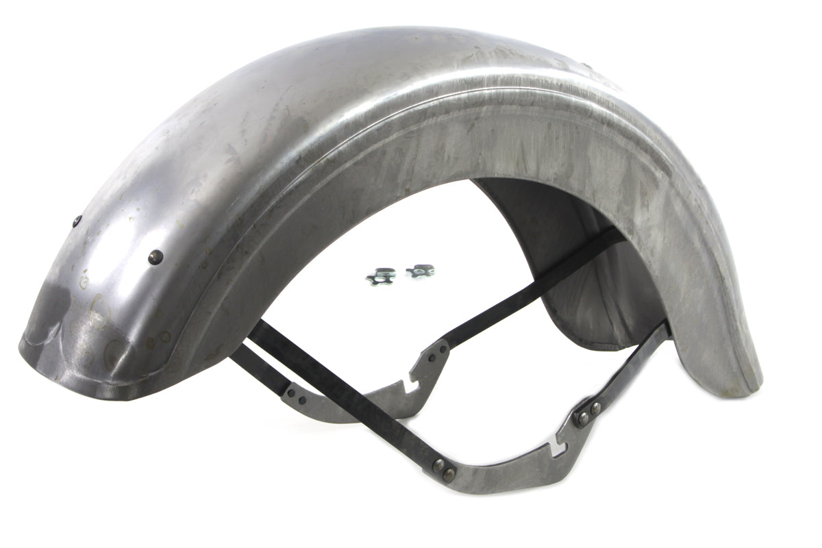 Spring fork front fenders are 7-1/2" wide for 16" or 18" wheels. The fender body is one piece construction with riveted on 3/4" wide braces. Fenders feature a raw finish.