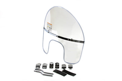 Features highly polished chrome mounts to attach to the handlebar risers to provide significant clearance for the rake and height adjustment 13-1/4"-21". Stainless steel and chrome hardware is included.