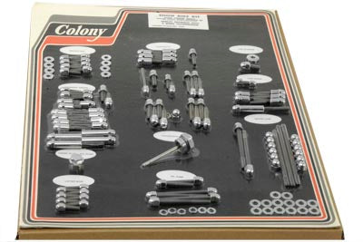 Colony acorn style chrome bolt kit for motor and transmission area on 1985-1986 Evolution 5-speed.