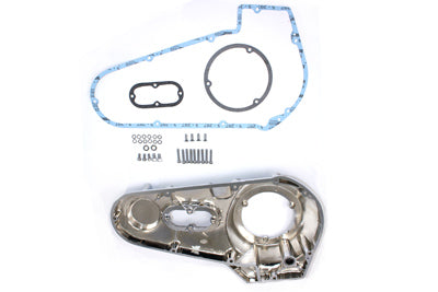 Chrome 4-speed outer primary cover kit includes primary cover, allen screws,outer primary starter bearing and gasket for derby, inspection and outer cover.