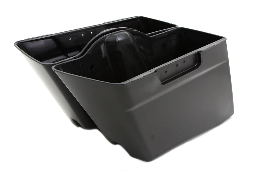 Deep style raw plastic hinged saddlebag bottom set only. Saddlebag bottoms have a 3" stretch and are notched for muffler body on the under side.