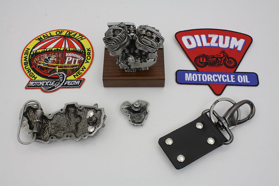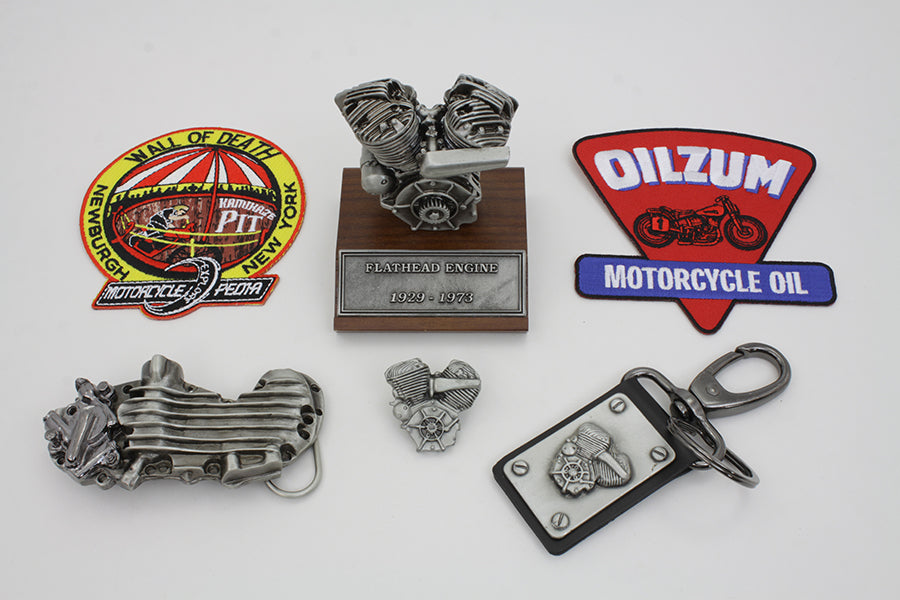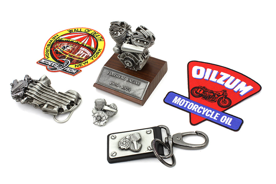 Flathead gift set includes motor model, keychain, lapel pin, belt buckles and patches that can be ironed or sewn on.