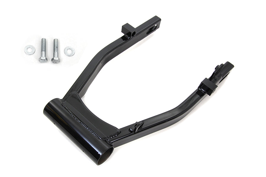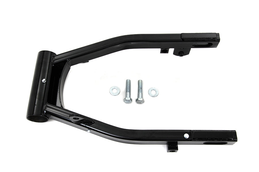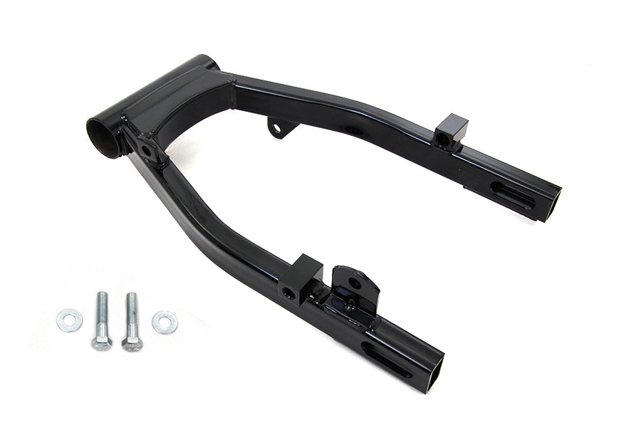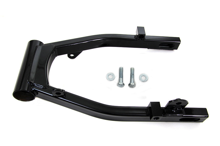 Black standard type frame swingarm is for 4-speed chain drive models. Swingarm shock mounts are welded 10.67" back fromt center of swingarm bolt. Bearings and races are not included. For use with banana style caliper only.