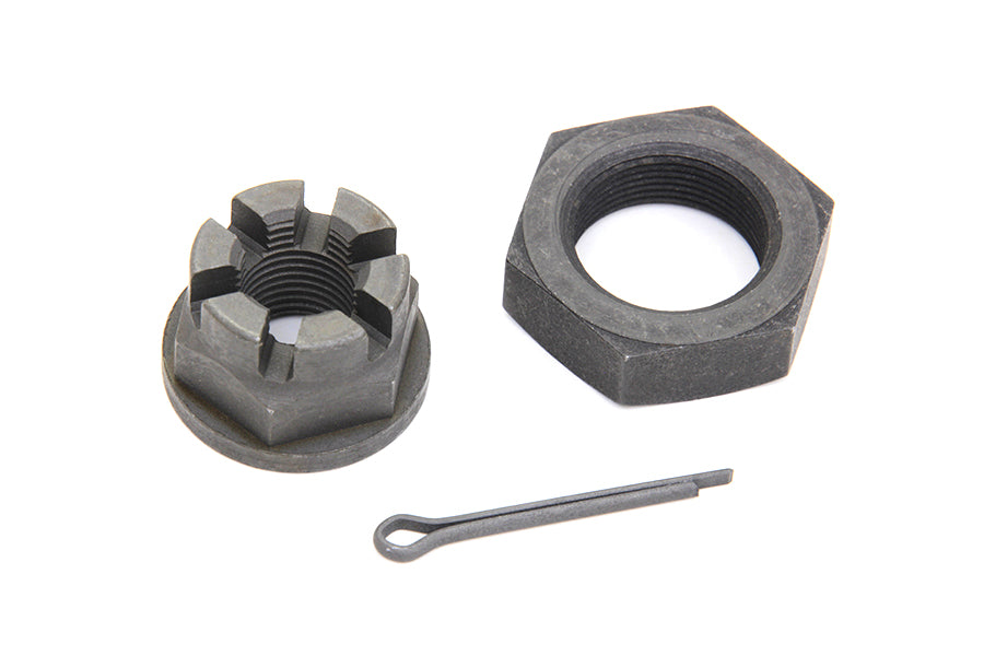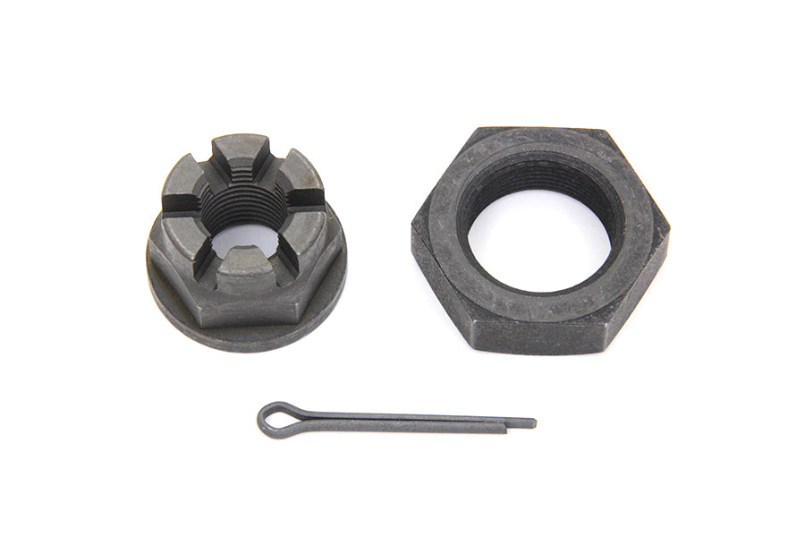 Parkerized front axle nut kit includes sleeve nut, castle nut and cotter pin for 1936-1948 Big Twin and 1930-1936 VL.