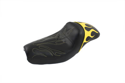 Yellow flame style gunfighter seat features sewn inlay of colored flames on rear pad area with matching flame stitch and thread in front driver area.