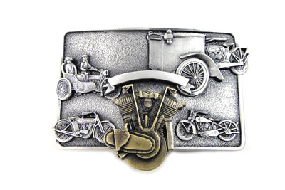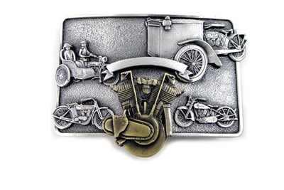 JD belt buckle with four motorcycles and JD motor depicted. Bronze colored motor overlaid on silver pewter patina buckle .