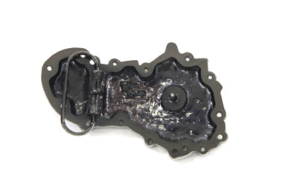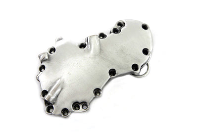 Knucklehead cam cover belt buckle with a silver finish. buckle is in the shape of a 1939 cam cover and measures 4" x 2".
