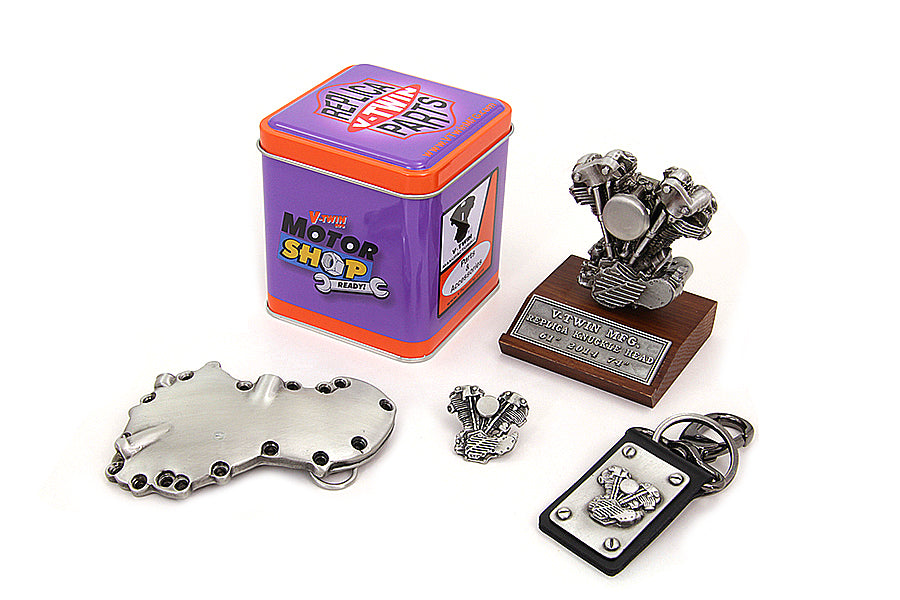 Knucklehead gift set includes motor model, keychain, lapel pin, belt buckle in a decorated metal gift box with lid.