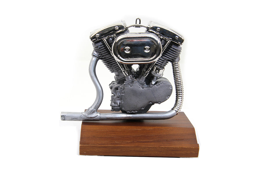 Shovelhead flat side 1:6 scale motor model with authentic details, including exhaust header set! Full pewter casted and fully asembled on a wooden display base.