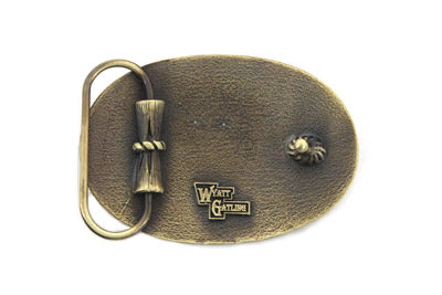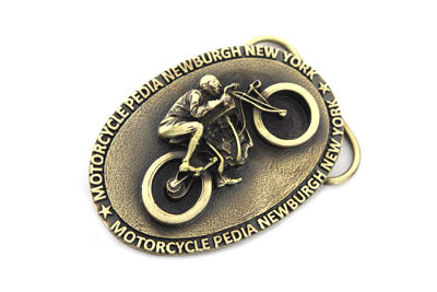 Oval Board Track belt buckle is solid cast pewter with a brass patina finish. Buckle measures 5/8 X 2" wide.