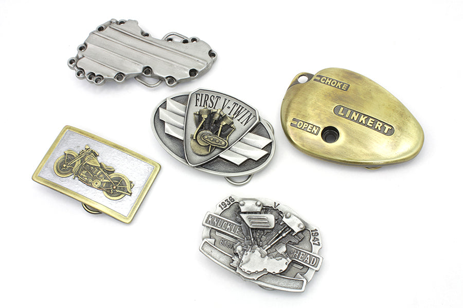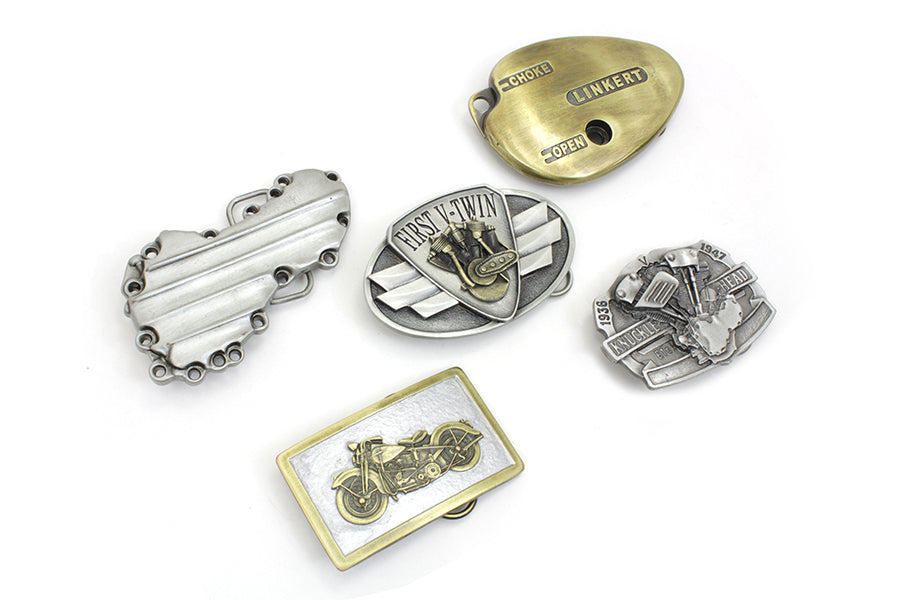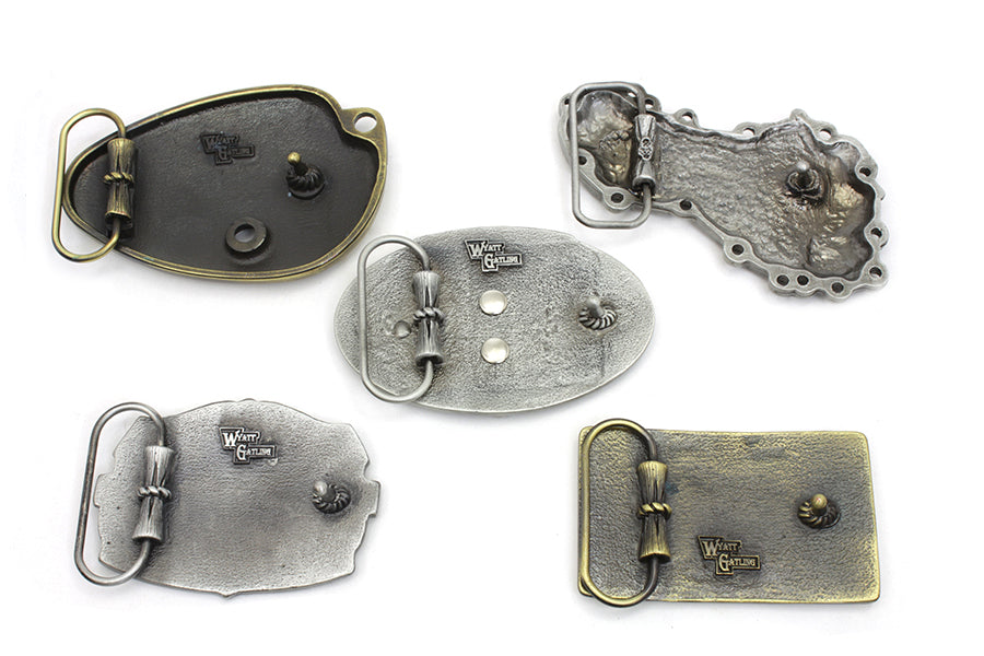 Set of five antique classic designs by Wyatt Gatling. Detailed cast pewter buckles with excellent patina finish applied.