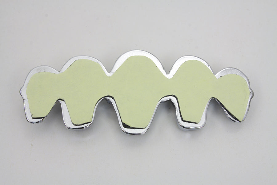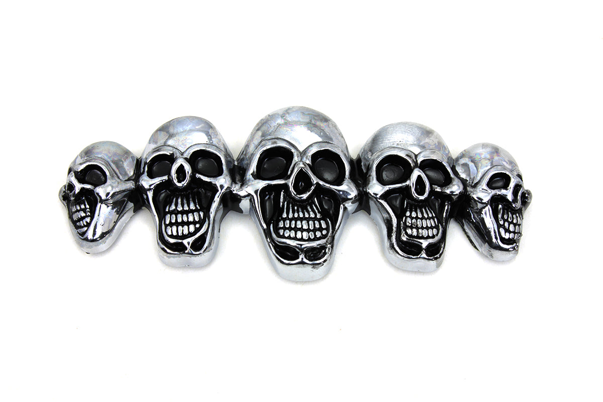 Pewter 5 skull emblem measures 3" x 1" with an adhesive back.