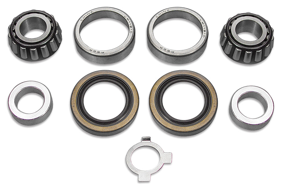 Rebuilt kit includes spacers, bearings, races, seals, and lock tab.