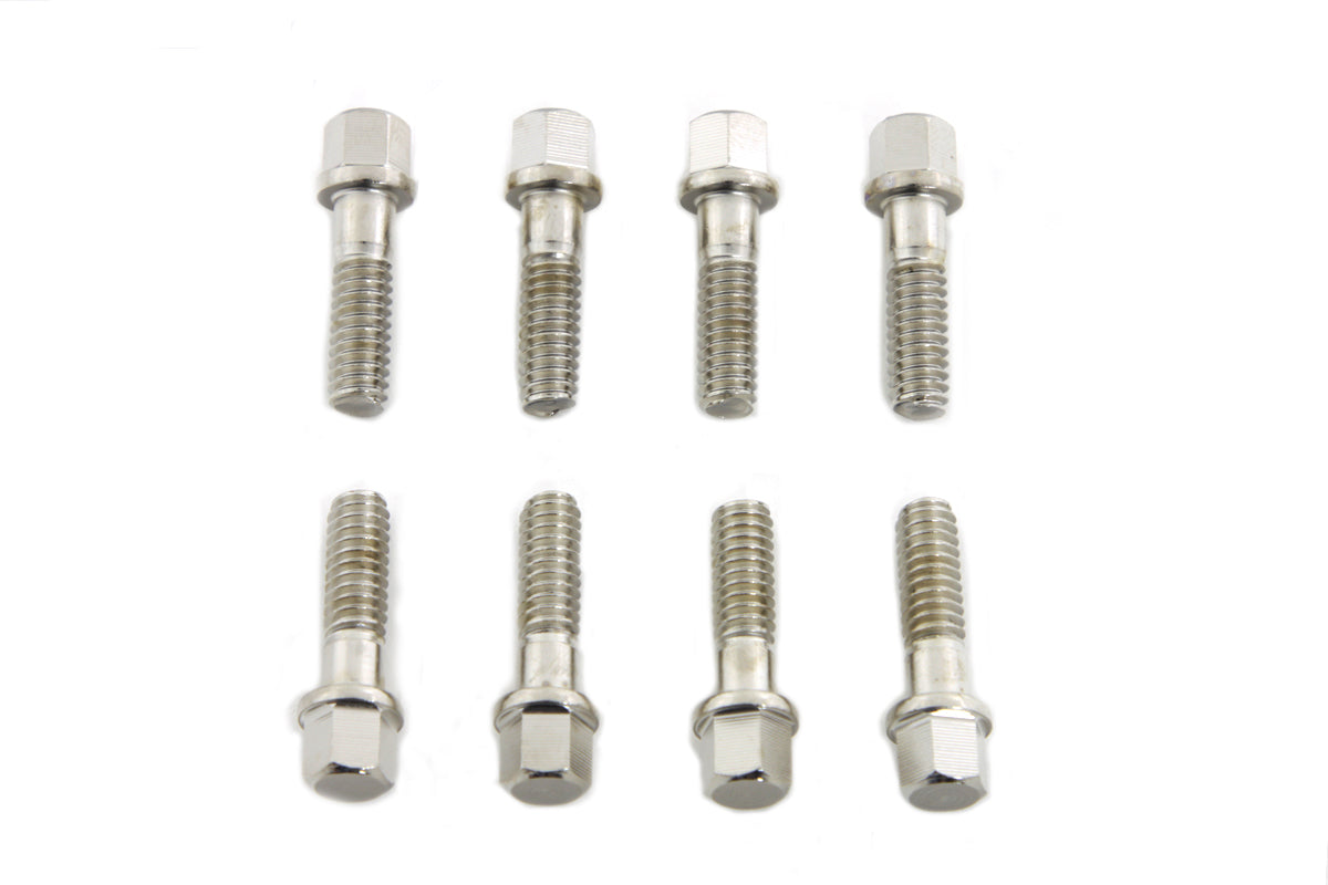 Tappet base bolt set of eight with 1/4" x 20UNC thread, is nickel plated, and has a hex shaped head.