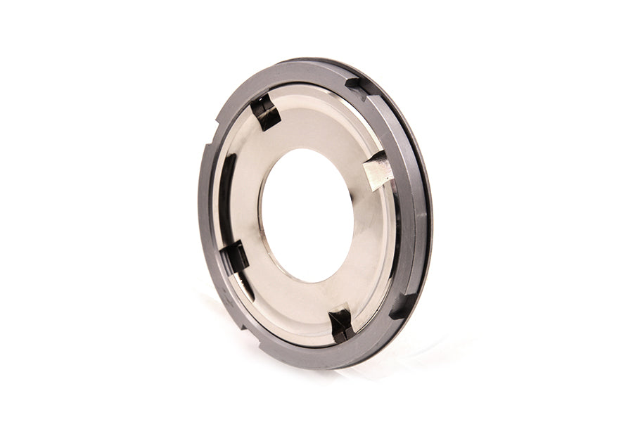 VL hub lock nut is nickel plated and has 4 slots to accept tool.