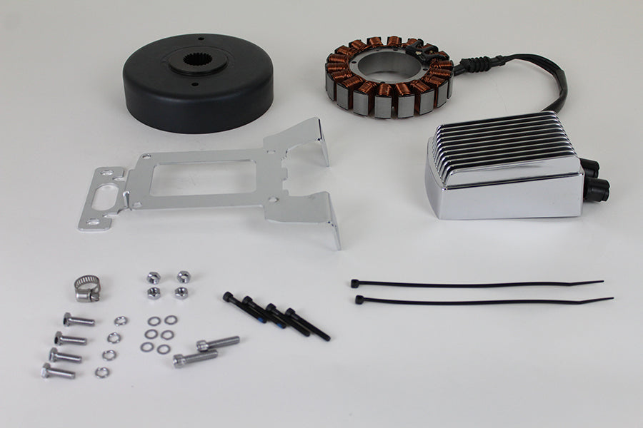 Charging system kit includes the voltage regulator and mounting bracket featuring a chrome finish with the rotor and stator.