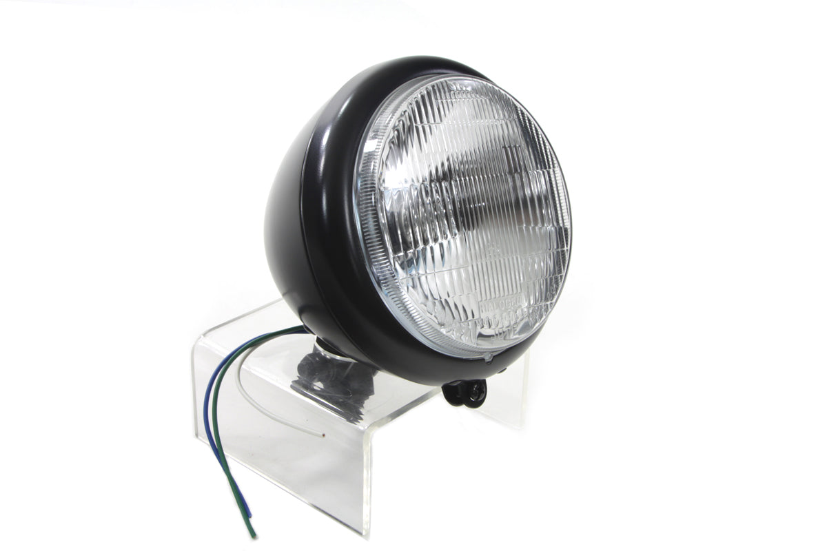 Black 5-3/4" round 12 volt halogen tear drop V-Twin headlamp includes mount eye bolt and 12 volt 60/55 watt bulb.