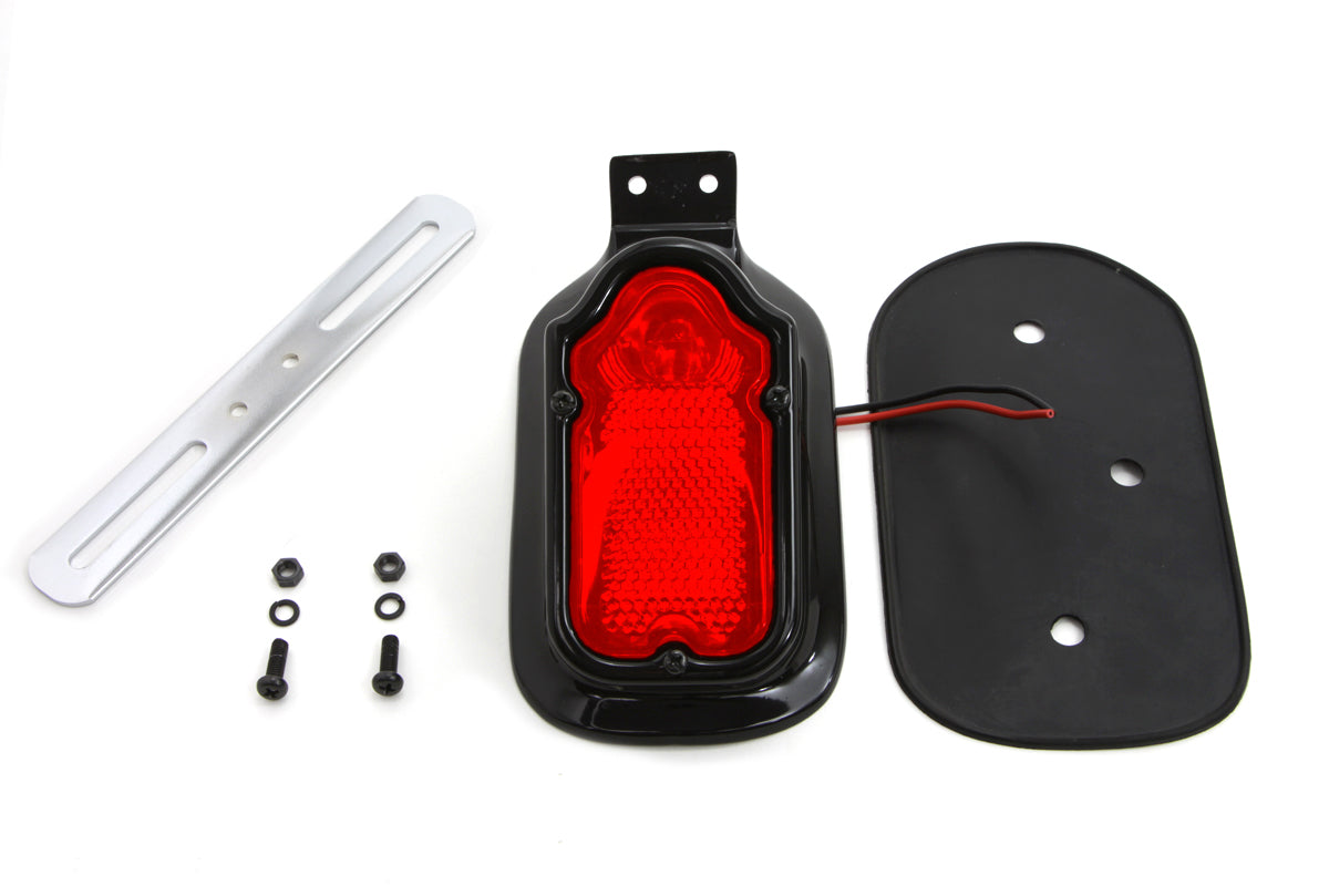 Black tombstone style tail lamp assembly has a chrome license plate bracket.