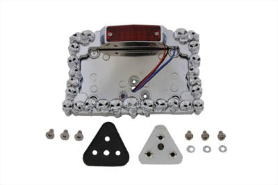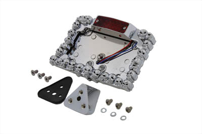 Chrome mini rectangular LED tail lamp with 3 hole horizontal side mount skull plate frame and spacer block.