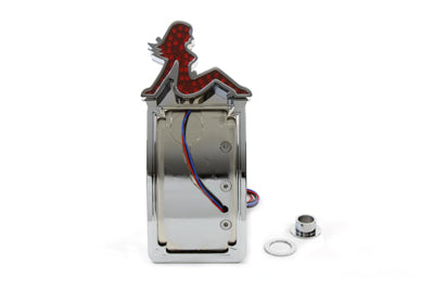Lady luck LED tail lamp chrome with curved vertical thorn style plate frame and removable bracket.