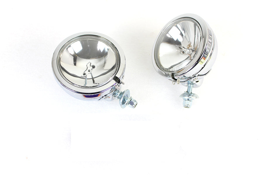 Chrome 12 volt style spotlamp set includes clear single beam bulbs installed and mount spacer.