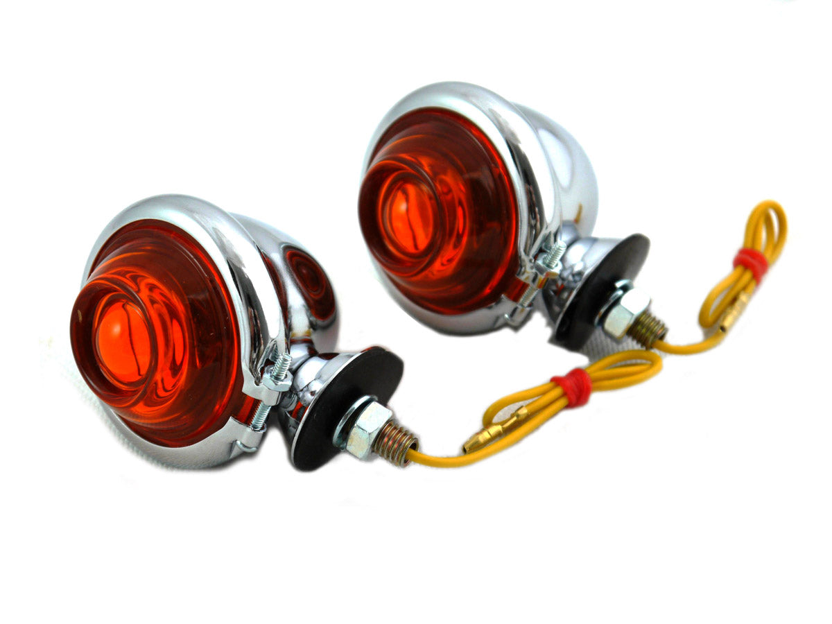 Bates turn signal set features a bullet style plastic amber lens with a chrome housing.