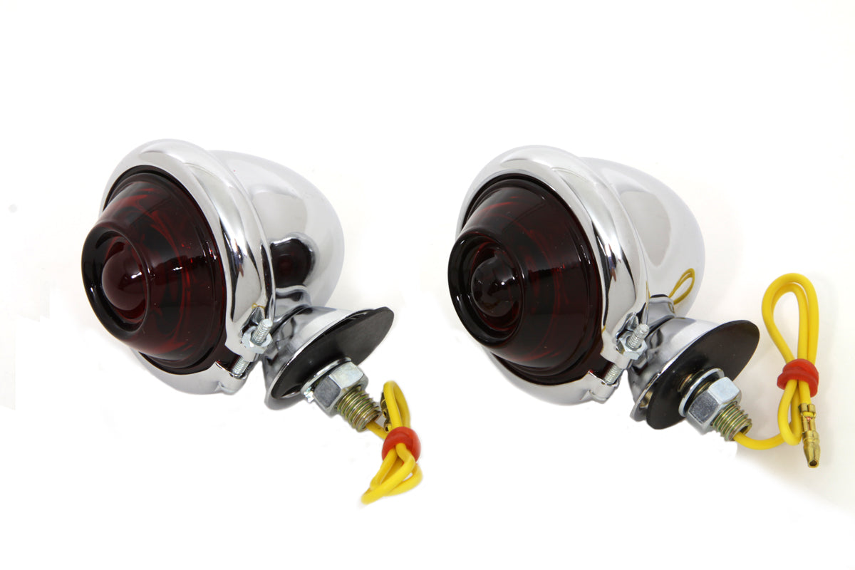 Bates turn signal set features a bullet style plastic red lens with a chrome housing.