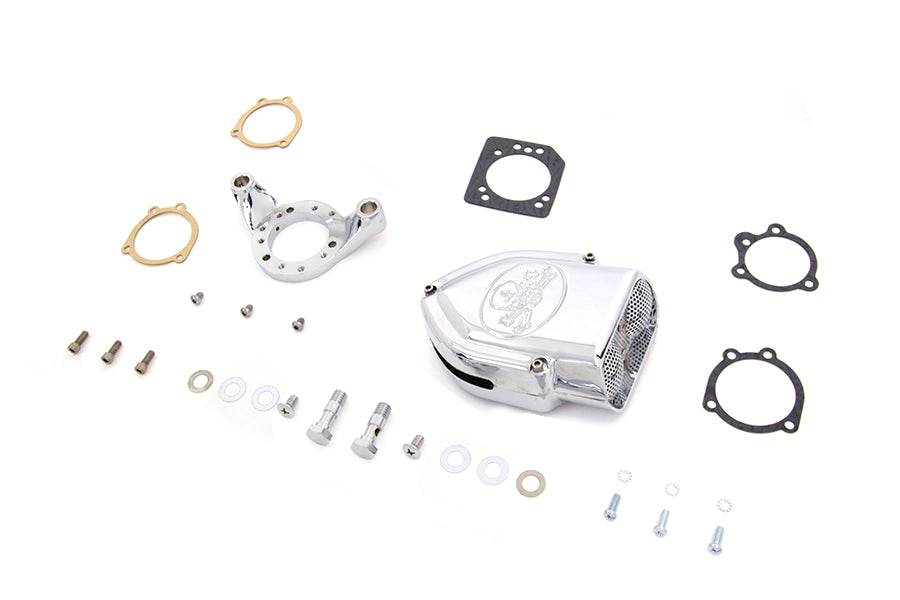 Wyatt Gatling assembly includes chrome v-charger shaped air cleaner with chrome skull cover, integral breather system with bracket, and mounting kit.