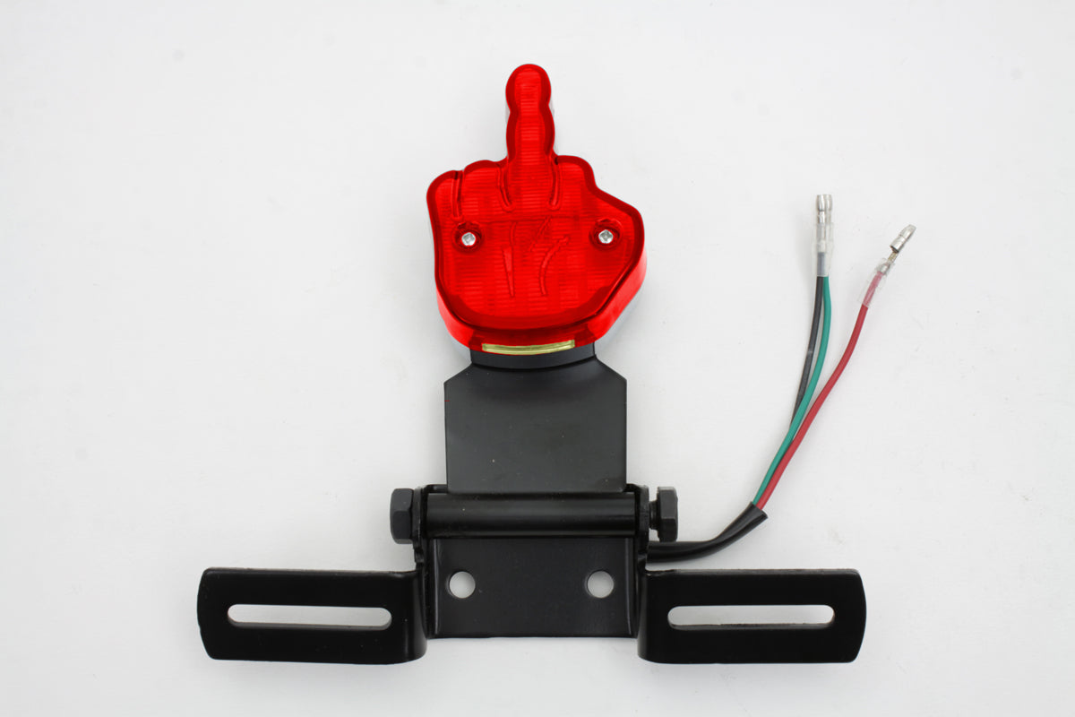 Finger LED tail lamp with red lens features chromed housing and black attached hinged license plate bracket.