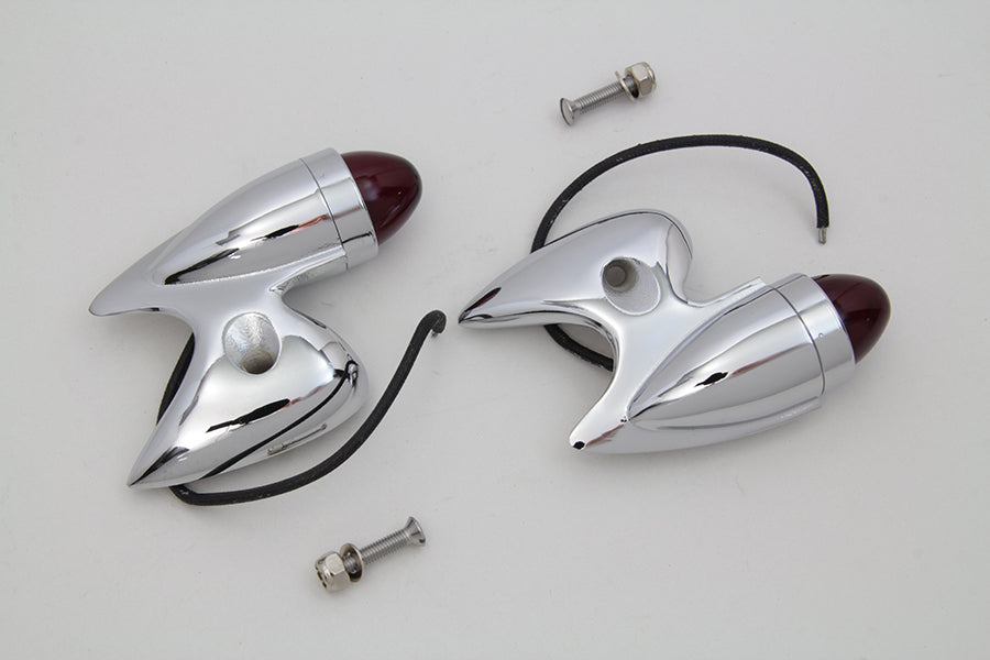 Chrome right and left side 12 volt 3 watt gunner tail lamps with die cast outer diameter, featuring glass red lenses.