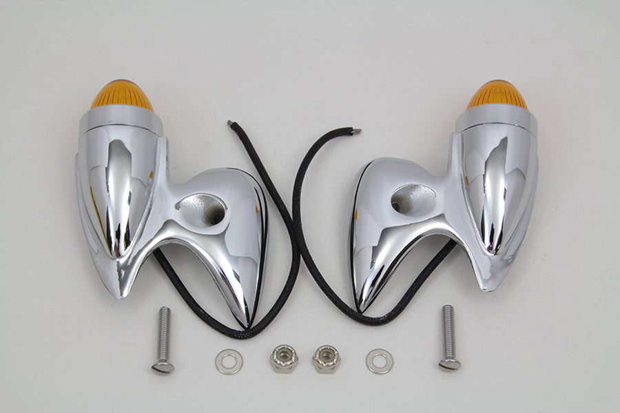Chrome right and left side 12 volt 3 watt gunner tail lamps with die cast outer diameter, featuring glass amber lenses.