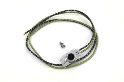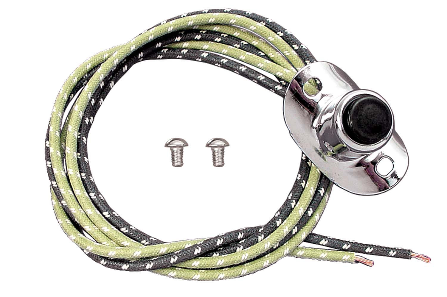 Tall style horn button switch features two cloth covered wires with one green and one black, chrome plated housing, and stainless screws.