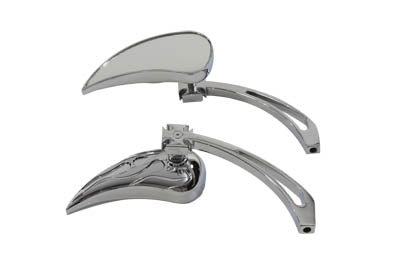 Chrome billet tear drop mirrors feature flame backs and cross head style billet stems.