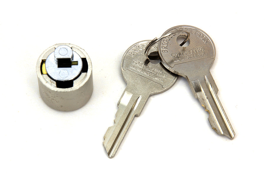 Ignition switch tumbler includes key lock and 2 full scale Briggs and Stratton style round shaped keys.