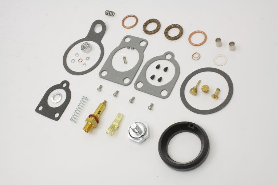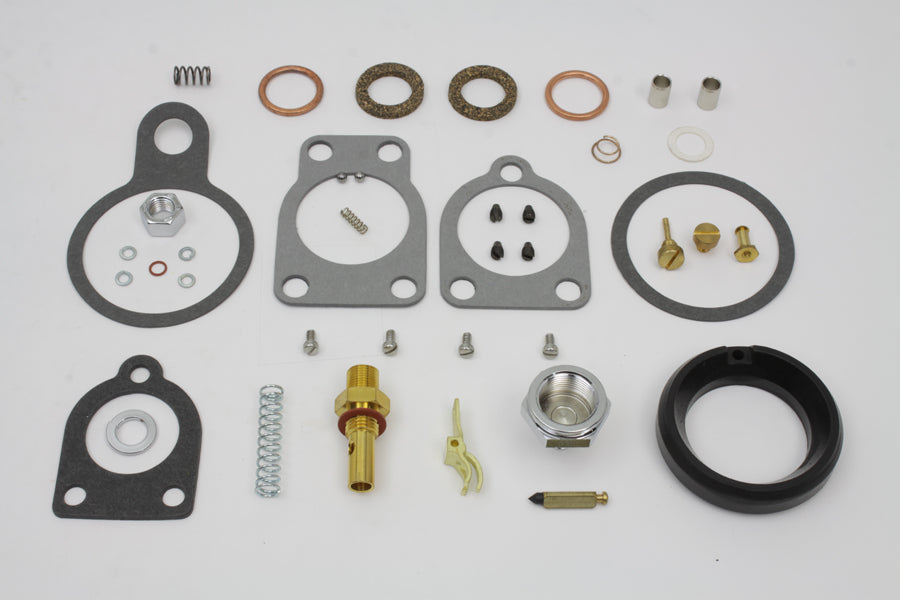 Replica Linkert carburetor overhaul kit with 1 1/2" throttle shaft, float bowl nut, and float lever.