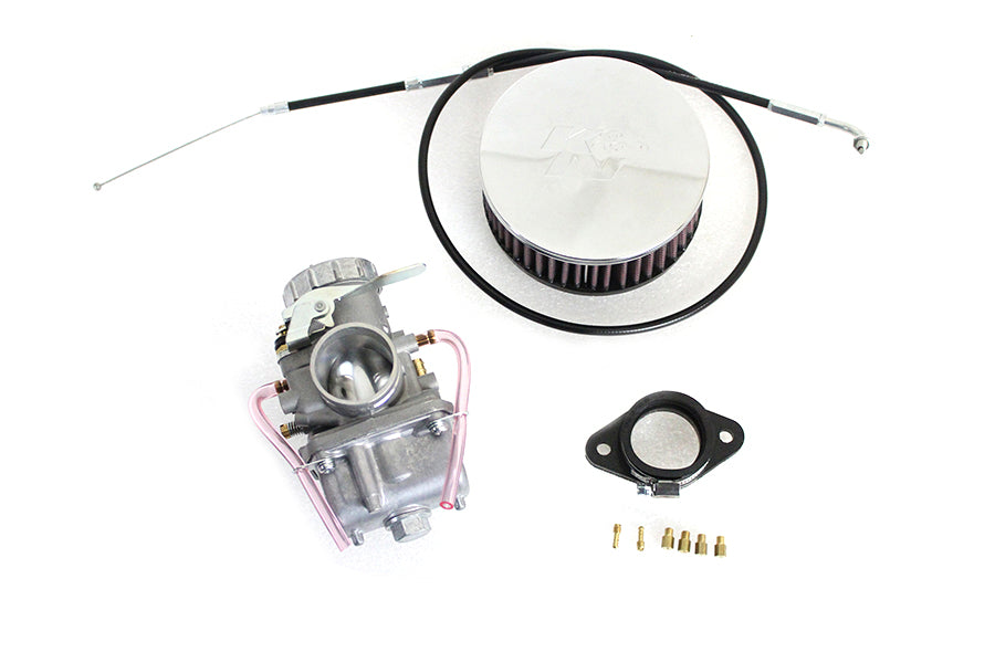 Mikuni 38mm carburetor kit includes air cleaner, carburetor, manifold adapter, hose clamps, main and pilot jet assortment, and throttle cable.