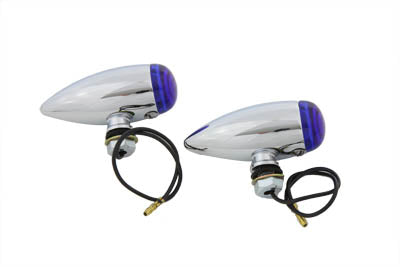 Chrome mini bullet lamp set with 12 volt 10 watt clear bulbs , blue lenses, and a single wire.