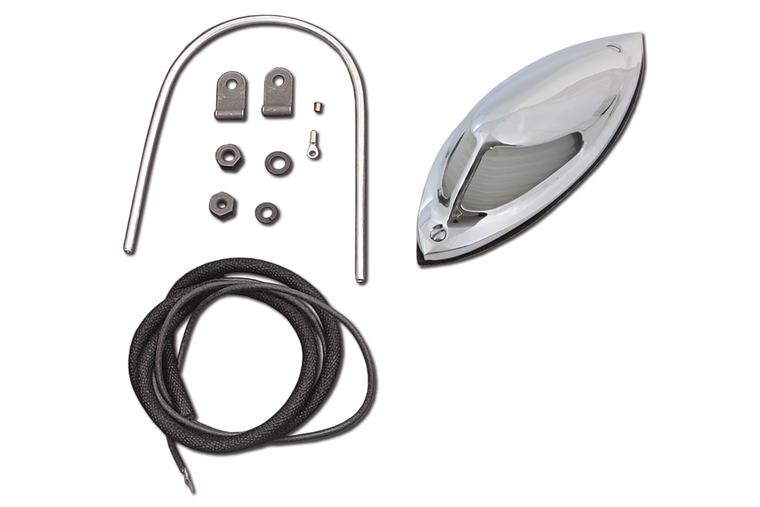 Replica front fender lamp kit includes clear glass lens and light, wire, and hardware kit.