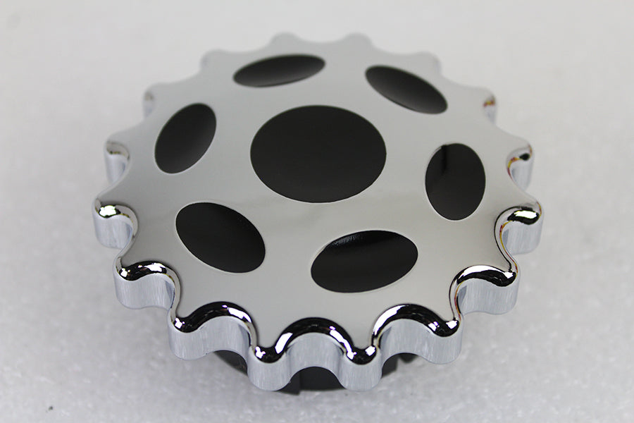 Sprocket style dummy gas cap is for the left side fuel gauge opening and features a chrome finish.