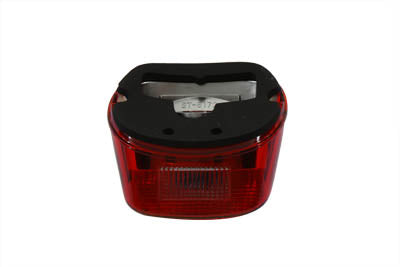 Red with blue dot laydown style tail lamp, clear lens with license plate lens facing down.