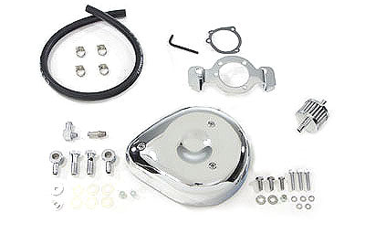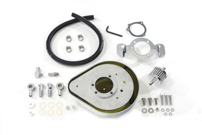 Tear drop smooth air cleaner kit include a chrome air cleaner assembly with smooth cover, chrome mount bracket, and a breather kit with a black hose and breather unit or bracket only as required.