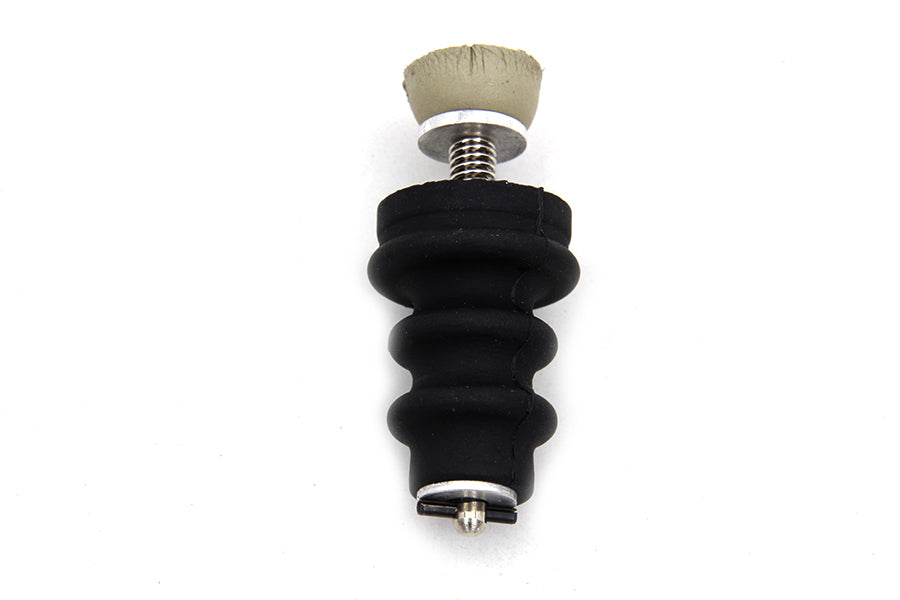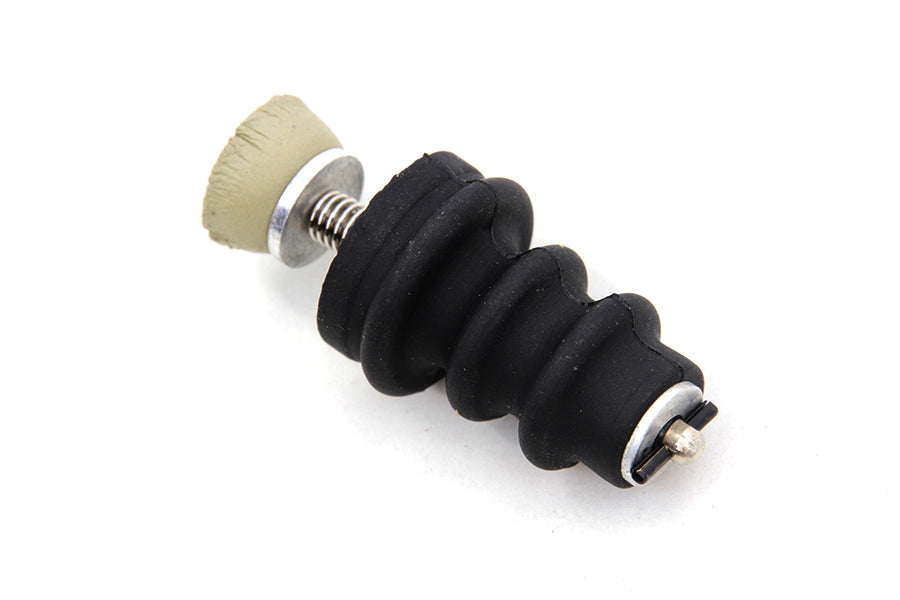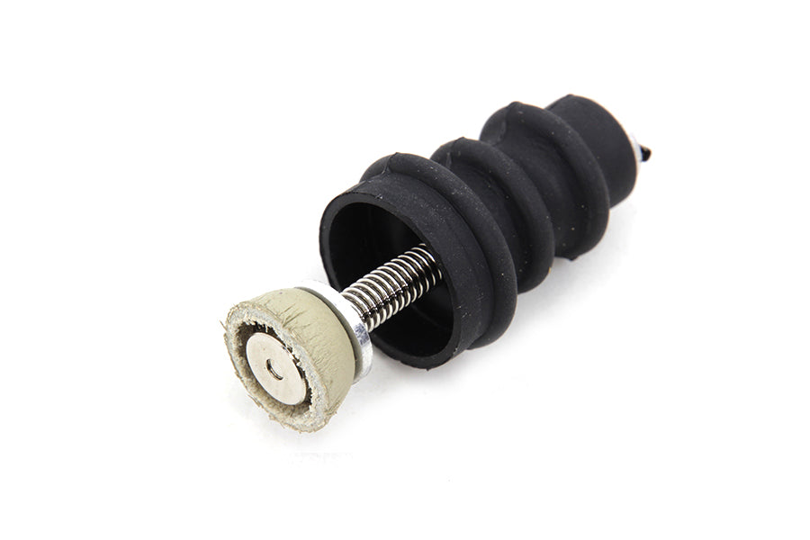 Tillotson carburetor pump assembly includes leather pump piston with shaft, rubber boot, and spring that are assembled.